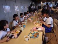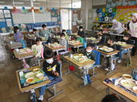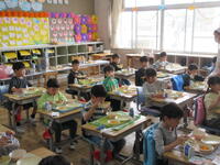 。先生と一緒に給食の準備をしながら、全員そろって「いただきます。」のごあいさつ