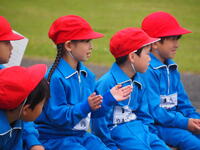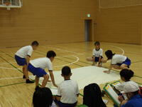 。50m走、ソフトボール投げ、立ち幅跳び、反復横跳び、上体起こし、長座体前屈の種目を行い、子供たちの基礎的な体力を測定します