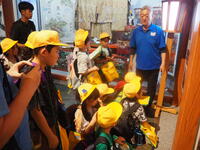 。山車会館では大きな山車を見学したり、山車まつりの様子や山車の歴史について調べました。見上げるほど大きな山車は迫力満点でした。