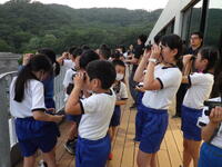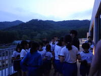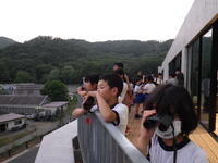 夕食後には星空観察です。あいにくの曇り空で星は見えませんでしたが、みかも山周辺の景色や50号線を通る車など双眼鏡で見たり、施設の方から星についてのお話を聞いたりと楽しい時間を過ごしました。
