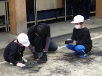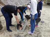 いよいよ杉板焼きです。説明をよく聞いて、安全に気を付けて薪を割ったり、火を起こしたりしました。起こしたき火に杉板を入れて焼き、焼いた杉板をたわしや布できれいに磨きました。最後まであきらめずに丁寧に磨いていました。