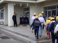 王冠中学生の皆さん、笑顔での明るいあいさつをありがとうございましたお辞儀。小学生にも笑顔のあいさつが広がっていますにっこり