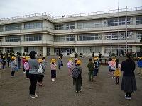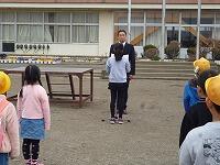 令和元年度の離任式が行われました。この度、お別れする先生はお一人。1年生から6年生まで、通学班で集合、今回は校庭に広く整列した形での式となりました。