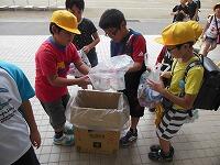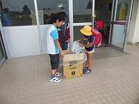 昇降口前で、環境美化委員の児童が回収をしている様子です。