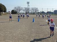 トラックを3コースに区切り、低、中、高学年ごとに分かれて走っています。