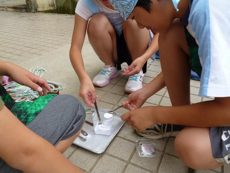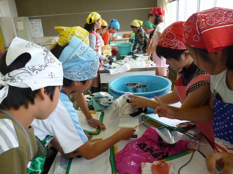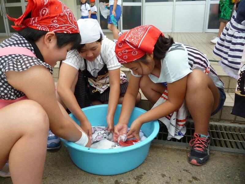 自分たちで持ってきた汚れ物の重さや適量の洗剤・水を測って手洗い開始。