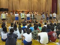 6月23日に行われた音楽集会は、音楽クラブのトーンチャイム演奏による「赤津小校歌」で始まりました。この日の発表学年は3年生。めあては「見る人も自分たちも楽しめるよう歌や演奏をすること」。めあてどおりのすてきな発表になりました!