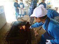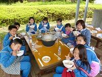 野外調理で大鍋力うどんづくり。火の当番、食材準備、食器用意などみんなで分担しながら、協力して調理しました。