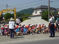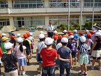 まず、2時間目に、1・2年生が道路や横断歩道の歩き方の学習をしました。6月8日に行う地域探検の事前練習も兼ねて行いました。