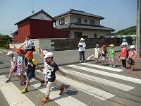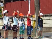 始めに、全員で学校前の横断歩道を実際に歩きました。手を元気よく挙げて、左右確認もできました。