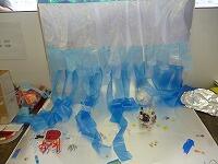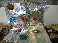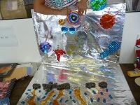みんなで持ち寄った材料の中から、自分たちの「キラキラの世界」のイメージに合う材料を選んで作りました。