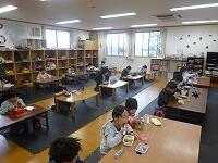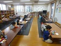 お弁当風景 間隔をとり「もぐもぐタイム」を心がけ、衛生に十分留意しています。