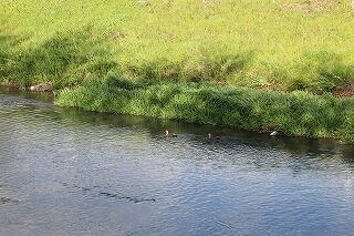 学校西の赤津川には、最近、つがいのカモが仲よく泳ぐ姿が見られます。