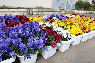 昇降口のパンジーは卒業式、入学式に活躍しました