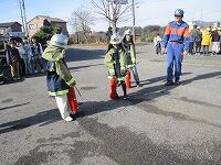 ヘルメットや防火服だけでもそれなりの重さがあるため、子供たちは楽しみながらも