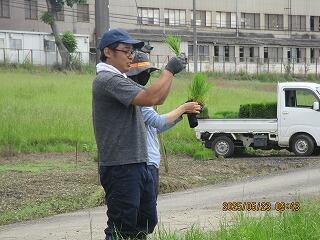 次に水田で手植えの方法を教えていただき、水田の中へ!
