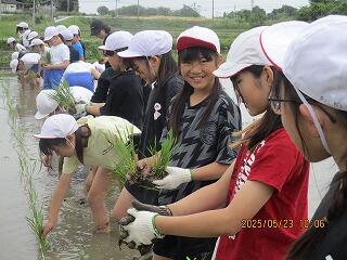 本日、5年生が、社会の授業で、学校の近くの田んぼで田植え体験をさせていただきました。