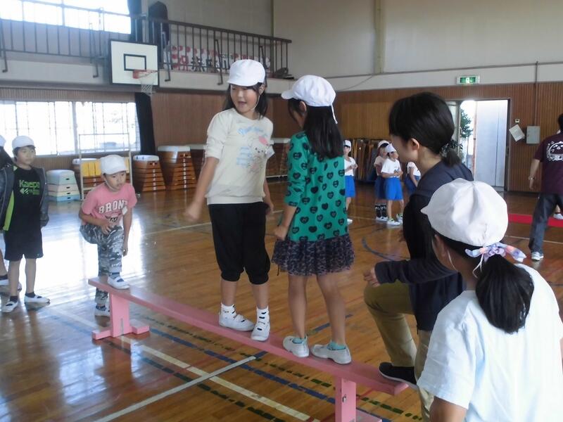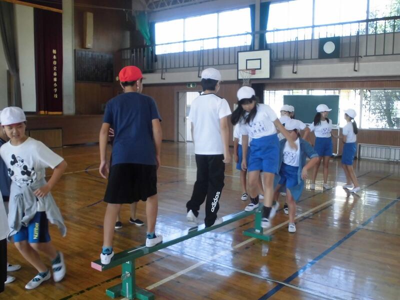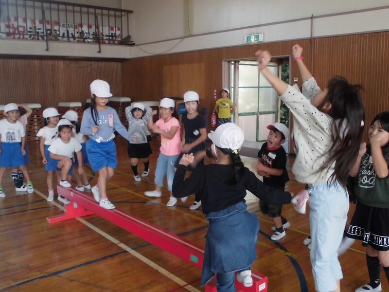 今日は、「平均台じゃんけん」ということで、平均台を使ったへびおにのようなゲームを