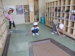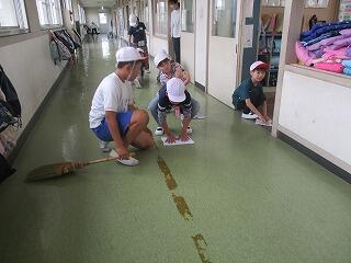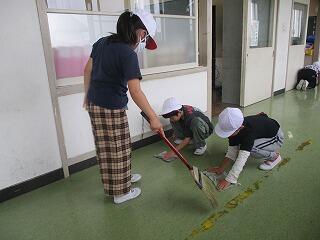 5月13日(月)1年生が初めての清掃班活動を行いました。入学後、今までは1年生全員で花壇の草むしりをしてくれていました。今日からは、縦割班での清掃スタートです。どの班も、雑巾のしぼり方や床ぶきの仕方を、上級生が優しく教えていました