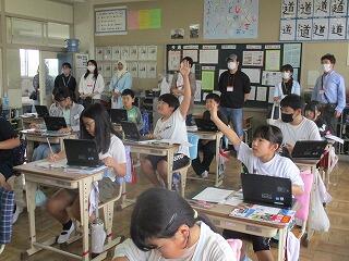 授業について、「各担任の先生が明るい雰囲気で授業を進めていたのがよかった。」「うまくいかないことを、なぜなのかと、自分で気付き、考えさせているところがすばらしいと思った」「児童がタブレットを使いこなしていて感心した。疑問に思ったことをその場で調べる時間を確保しているところがよかった。」「体育の授業でフラフープを使う際は、つまずいて転ぶ危険性があるので、児童の安全を考え、置き方等の指導をお願いしたい。」等の感想をいただきました。
