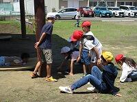 その代わり、1~6年生の縦割り班で集まり、年間5回遊ぶ内容を決めました。早く終わった班から、雨上がりの校庭に出て、水たまりを避けながら、ドッジボールやへびおに、鬼ごっこ、だるまさんがころんだなど、職員も一緒に班ごとに楽しく遊びました。