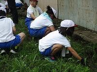朝の会後、15分間、全校児童が校庭の除草をしました。各学年の担当場所で、一生懸命草を取ったり、取った草を運んだりしてきれいにしました。