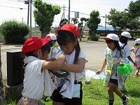 初期消火訓練の様子 大きな声で「火事だー」みんなに知らせてから、落ち着いて消火しました
