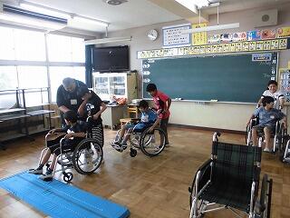 4年生が、総合的な学習の時間に高齢者疑似体験や車椅子体験を行いました。おじいちゃん、おばあちゃんの思いに気付いたり、介護の仕方を知ったりすることをめあてに活動しました。社会福祉協議会の方に指導してもらいながら、体験活動を行いました。