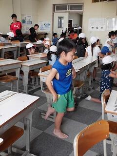 運動委員会の企画で、体育教室が昼休みに体育館で行われました。1年生対6年生、2年生対3年生対抗で平均台じゃんけんを行いました。勝って喜び、負けて悔しがり暑さに負けずに活動できました。