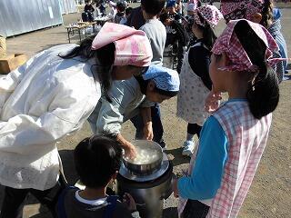 七輪に炭をおこしてお餅を焼いたり、お釜でご飯を炊いたりしました。こんがり焼けたお餅の香ばしさ、大きなお釜で火加減を調節しながら炊いたご飯の、良い香りとふっくらとしたお米のおいしさを十分堪能しました。