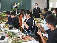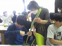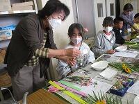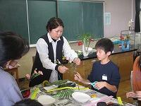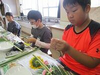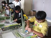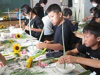 子供たちは、真剣な表情で、思い思いに、花の茎や葉をはさみで切って長さを調整したり、剣山に刺す際に角度や向きを変えたりして、作品作りを楽しんでいました。