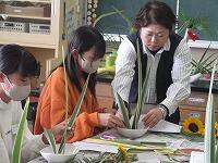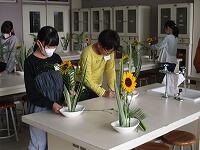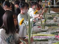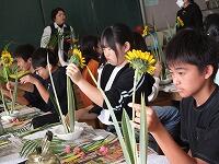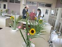 花器に見立てたお皿に、水と剣山を入れ、ニューサイラン、ヒマワリ、スプレーカーネーション、アレカヤシの順に、講師の先生方に手順を教わりながら、一生懸命生けました。