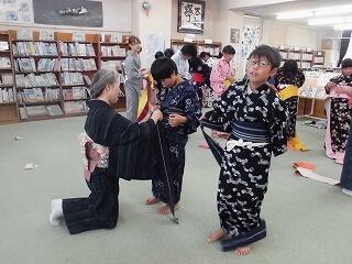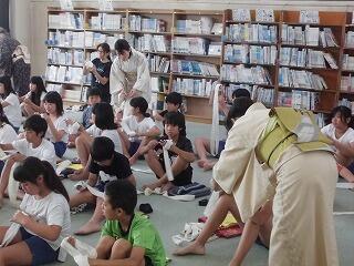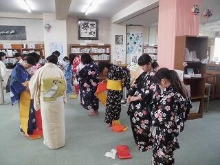 6年生が総合的な学習の時間に、和装礼法についての体験学習を行いました。日本文化や日本の心についての学習を今日から3回に分けて行います。