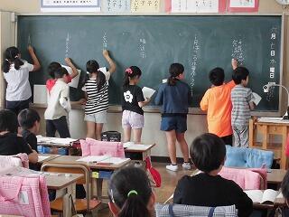 数、色、形を表す英語を学習しました。右の写真は、4年生の算数です。棒グラフ・折れ線グラフから、どんなことが分かるか(読み取れるか)を、黒板に書いています。学習に積極的な児童がどんどん増えています。