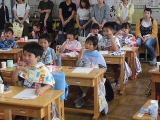 1年生を対象に虫歯ゼロ学校巡回指導が行われました。はじめに保護者を対象に学校歯科医の木村先生による講話がありました。続いて、歯科衛生士の上岡先生から1年生に歯みがき指導が行われました。