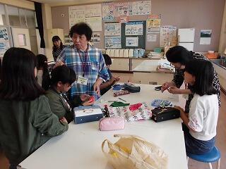 5年生が家庭科の学習で、はじめて手縫いを行いました。玉結び、玉どめをボランティアさんについてもらい、実習していました。11名ものボランティアさんにご指導いただきました。ありがとうございました。