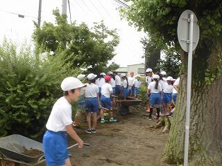 朝の活動のあかまっ子タイムで全校生による奉仕活動を行いました。校庭の東にたまった砂を運んだり、校庭の石拾いをしたりみんなで頑張りました。