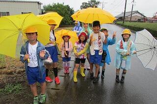 そして今日は、みんなが楽しみにしていた縦割り班でのウオークラリーです。あいにくの雨降りとなってしまいましたが、スタート時間を早めて実施しました。1年生が歩くスピードに合わせて、ゴミ拾いをしながらチェックポイントでゲームをして、約1時間かけて学校に戻ってきました。雨にも負けず、風にも負けず協力して頑張りました。