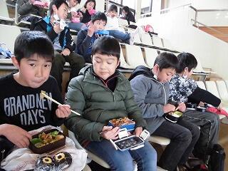 お昼は栃木市総合運動公園でたべました。芝生でたべる予定でしたが、まだ、雪が残っているのと寒さのため、体育館の観客席をお借りしてたべました。