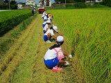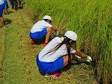 鯉沼さんご夫妻の米作りについてのお話や、刈り方の説明を聞いたり、質問したりした後、稲刈り鎌を使って実際に稲刈りを行いました。熱中症対策のため、予定していた時間よりも短い時間での体験になってしまいましたが、子どもたちは活動後の振り返りで「機械を使わずに鎌で刈るのは大変だ。」「とてもいい経験をさせてもらった。またやってみたい。」「米を作るのは手間がかかり大変。農家の人の苦労がわかった。」「親切にわかりやすく説明してもらってよかった。」等の感想を書いていました。