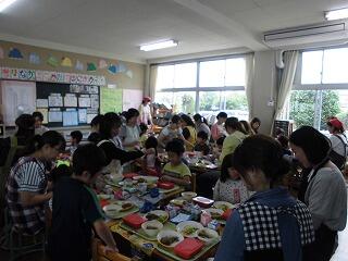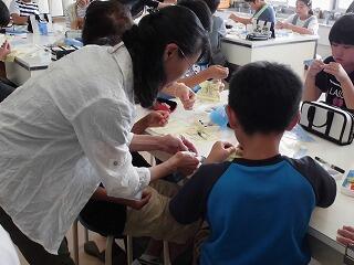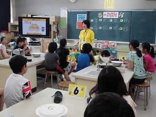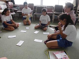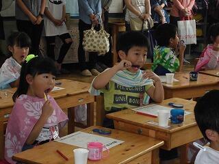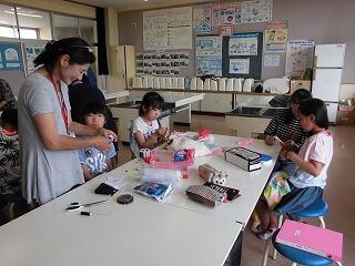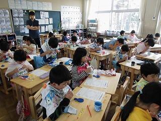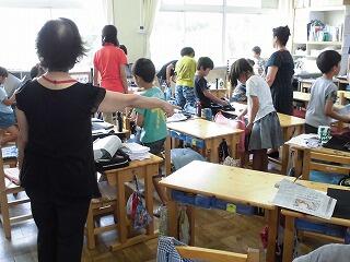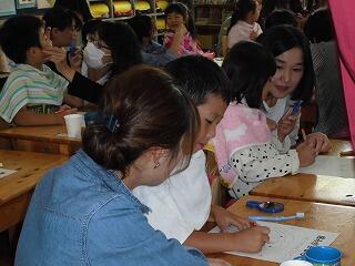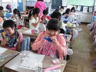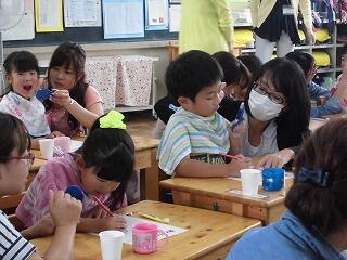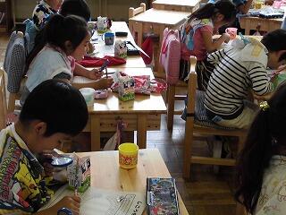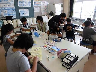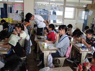 5年生にとって、裁縫は初めての体験になります。練習布を使って、玉結びや玉どめの練習をしました。おぼつかない手つきでしたが、ボランティアの方に教わりながら、なんとかできたようです。