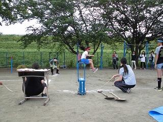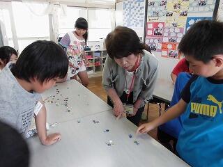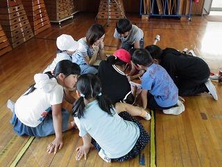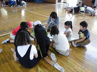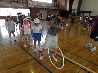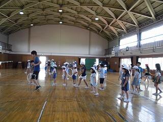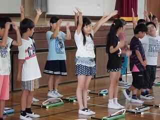 昼休みに運動委員会が中心となって、フラフープ跳びを行いました。運動委員会の児童が、フラフープに逆回転を加えて転がし、その上を次々に跳んでいきます。どのグループが多くの回数跳び越せるか競争しました。市場の多く跳べたグループは、11回跳べました。みんな楽しそうに汗をびっしょりかいて取り組んでいました。