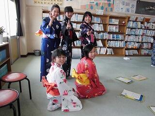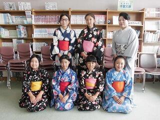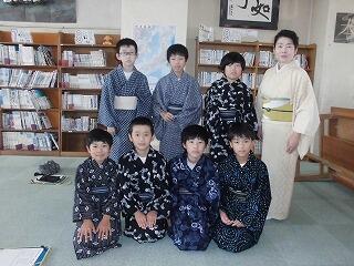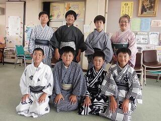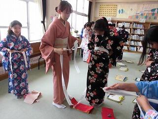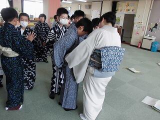 6年生が総合的な学習の時間に、伝統文化を学ぼうと和装礼法の学習をしました。今日が2回目で、着物の着付けは、1回目より手早く着ることができたようです。