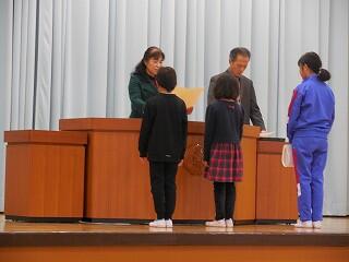 今学期の子どもたちの活躍を表彰しました。今年は例年よりも、読書感想文や理科研究・各種絵画の入賞者が多く、壇上での表彰は全員を対象に行うことができず、代表児童に賞状を渡すこととしました。持久走大会や鉄棒検定・多読賞・課題図書読破賞という校内の活躍における表彰もしました。子どもたちの大活躍、とてもうれしいことです。