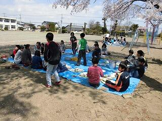 本日は晴天に恵まれ、また、風も強くなかった(昨日は暴風)ので、多くの学年が、満開の桜の木の下で、お花見給食を行いました。