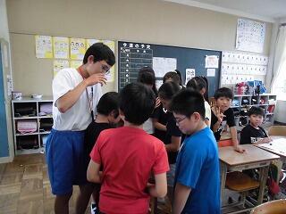 子どもたちはフレッシュな中学生先生に大喜びです。休み時間に、おしゃべりをしたり、ぶら下がったり・・・。3日間、元気に触れ合ってほしいと思います。