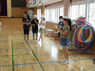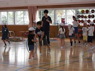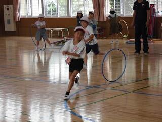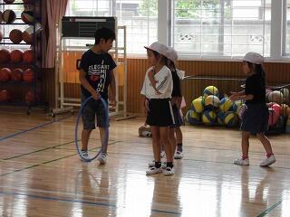 昼休みに運動委員会主催の、体操教室がありました。今日はフラフープを使って、回転しているフラフープを跳び越えるという遊びをしました。上級生が、上手にフラフープを投げたり、優しい目で下級生を見守っていたりする姿に、心が温かくなりました。来週は、棒を使った運動遊びをします。