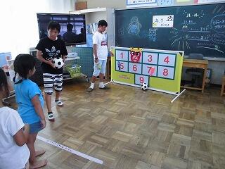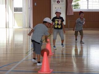 企画委員会主催のドリブル競争が、昼休みに開催されました。1~6年の児童が30名ほど参加しました。各チーム3人で、カラーコーンをドリブルしながら、まわります。優勝は、6年生、2位は1年生の男子でした。