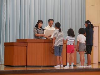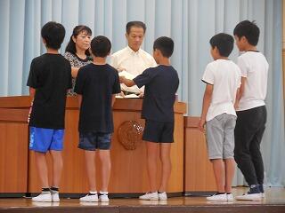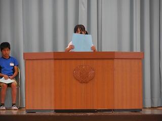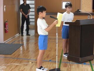 7月19日に1学期終業式が行われました。校長先生から、夏休みに、目標をもった生活をすること、ゲームの時間を家族で話し合って決め、守ること、課金に注意すること、大切な命を守ることについてお話ししていただきました。さらに、3年と6年の代表児童による、1学期の反省と夏休みの目標についての発表も大変立派にできました。