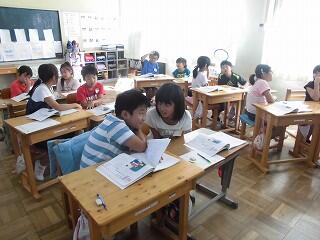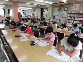 本日は気温が低いため、プールに入ることができず残念でした。しかし、図書室に、たくさんの児童が勉強に来ていました。午前中31人の利用がありました。みんな一生懸命、夏休みの宿題に取り組んでいました。